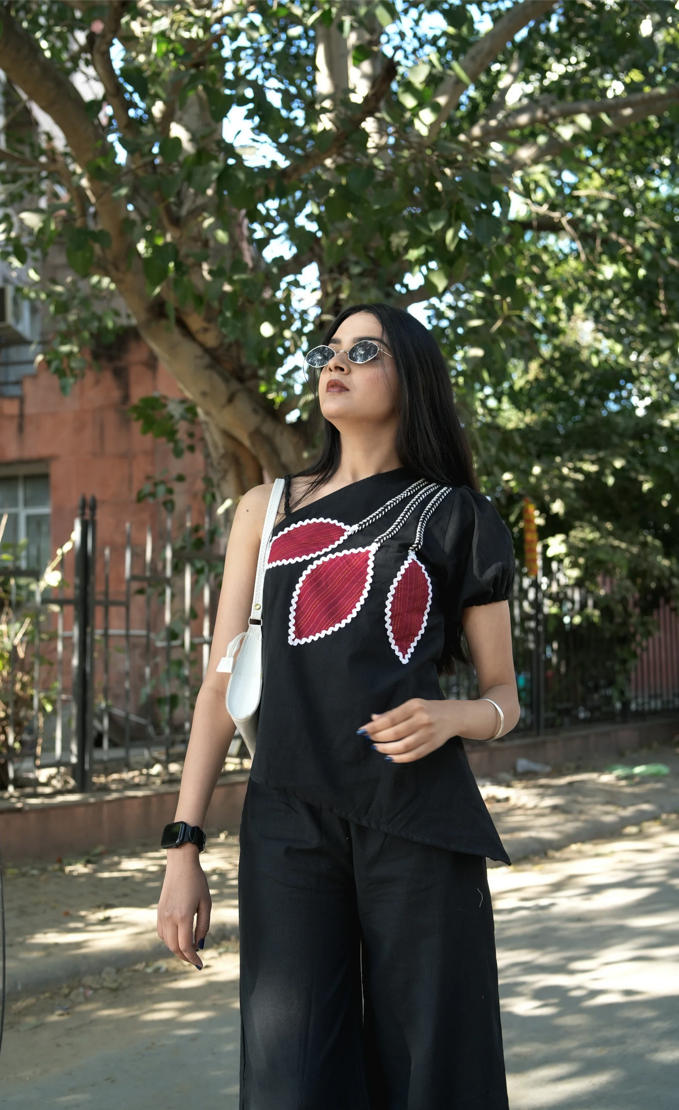 Elevate your wardrobe with this sophisticated cotton flex co-ord set, expertly crafted for modern women. The top features an asymmetric cut with one-shoulder design and delicate lace detailing, complemented by intricate patchwork embroidery that creates visual interest. Matching patch design work extends to the wide-leg trousers, ensuring a cohesive, curated look. The flexible cotton blend offers comfort without compromising on style, making this set ideal for both casual outings and semi-formal occasions. The unique asymmetric silhouette and coordinated embellishments deliver an effortless yet polished aesthetic that stands out from conventional designs.