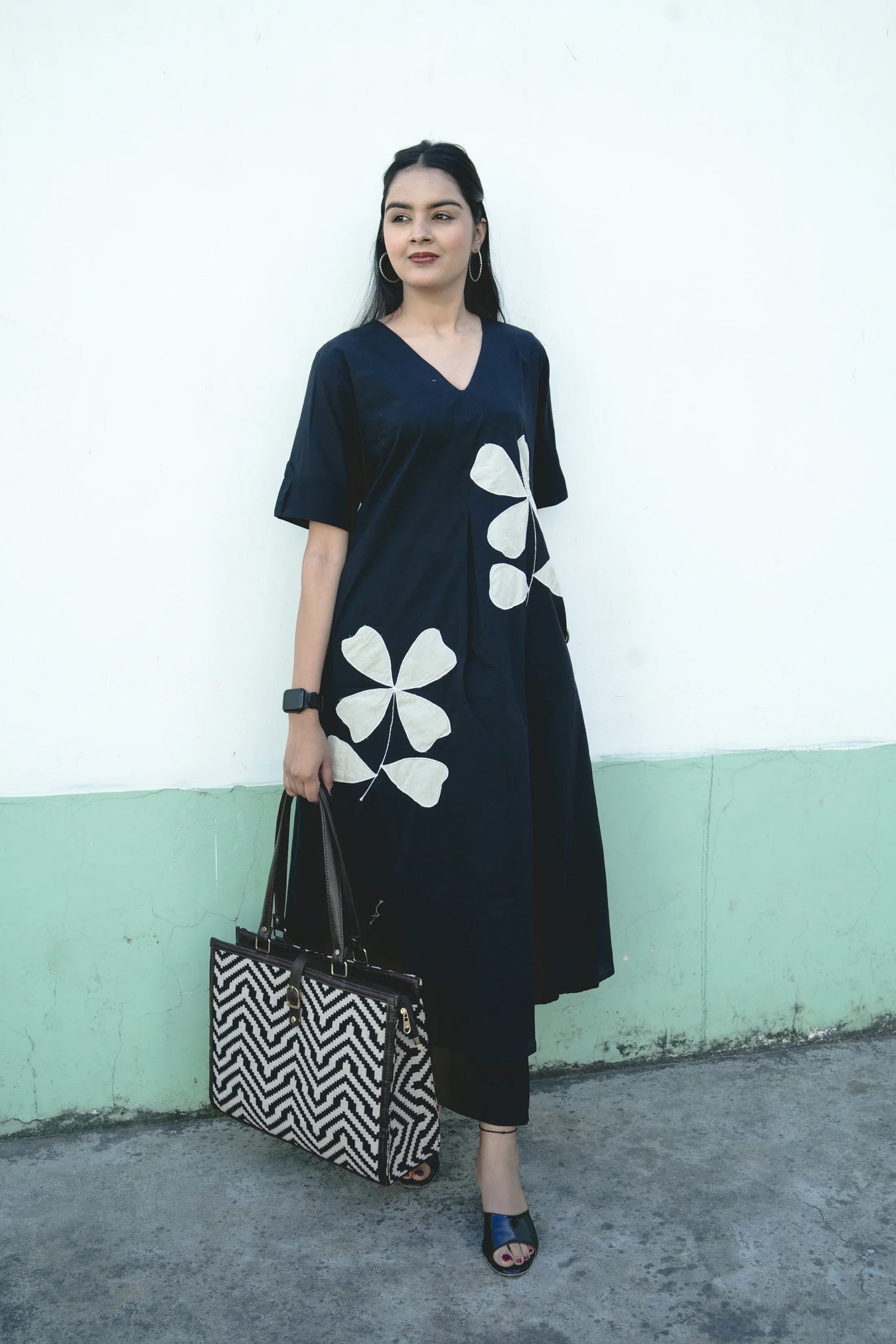 cotton v neck aline kurti with flower patch work with solid pant set for womens