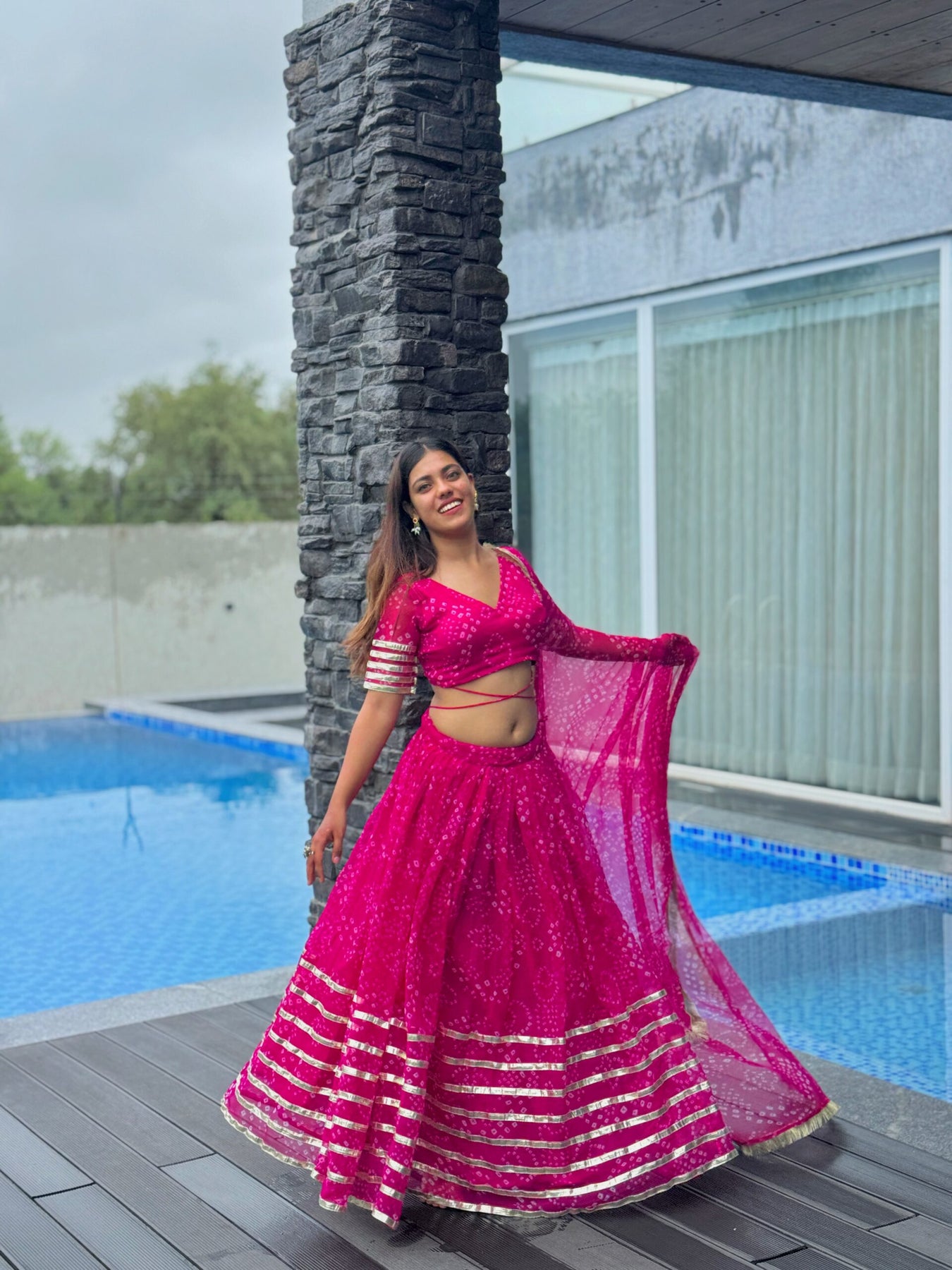 Step into the spotlight with this vibrant Fuchsia Pink Bandhani Lehenga Choli. The lehenga is adorned with traditional bandhani print and finished with wide, shimmering gota patti lace borders for a regal touch. The matching choli features a deep V-neckline, short sleeves with lace detailing, and stylish back tie-up strings for an added hint of allure. The lightweight bandhani-printed dupatta completes the ensemble with coordinated gota patti edging.