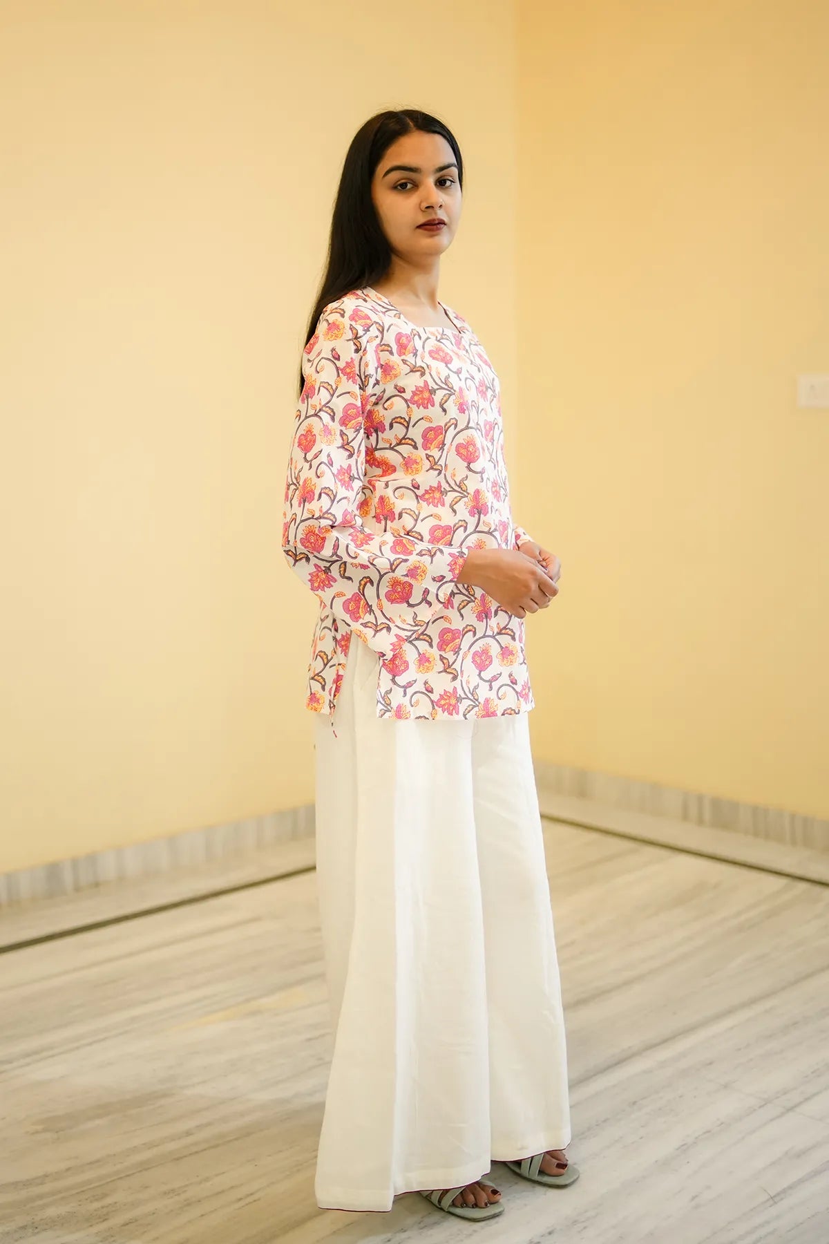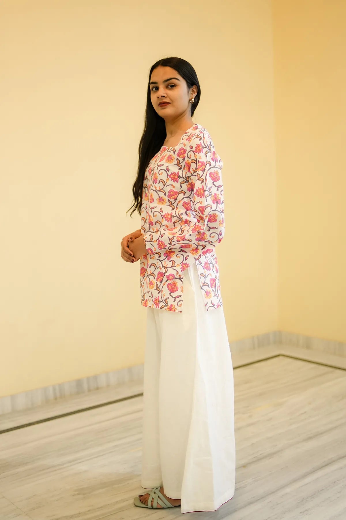 A feminine peach cotton tunic with a square neckline and swirling vine prints, paired with crisp white wide-leg palazzos for a breezy summer aesthetic.