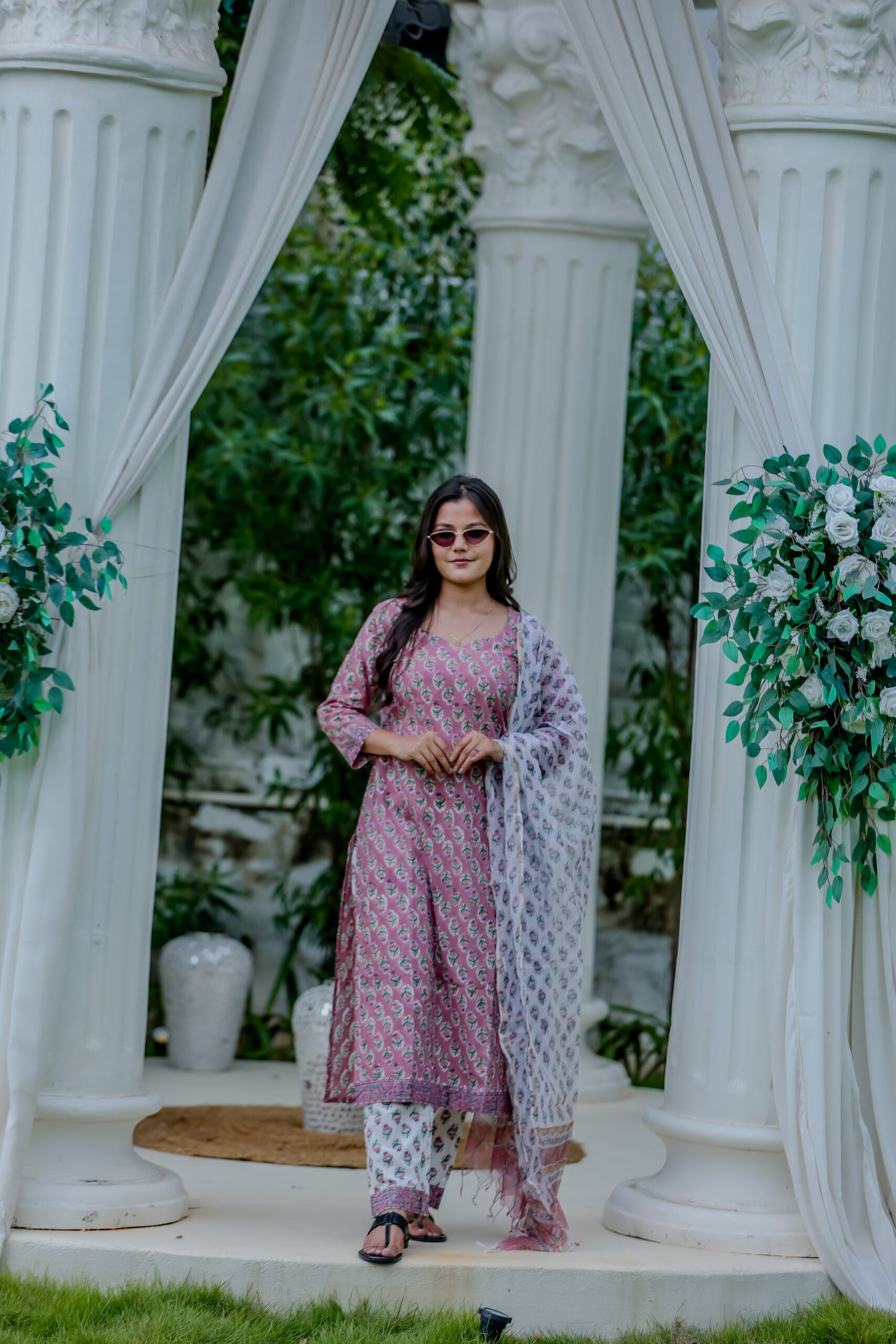 Give your ethnic wardrobe a refreshing touch with this mauve cotton kurta pant set. The kurta is crafted with all-over ethnic motifs in soothing tones, featuring a V-neckline and three-quarter sleeves for a modern yet traditional appeal. It comes with contrasting white printed pants and a light dupatta with matching motifs that complete the look gracefully. This set is perfect for festive gatherings, casual outings, and everyday wear, keeping you stylish and comfortable all day long.