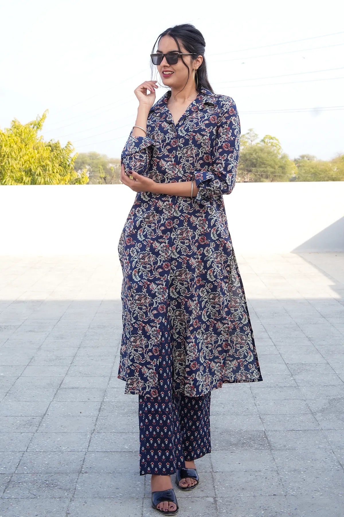 Soft cotton kurta paired with matching trousers in intricate vine print, ideal for office and casual styling.