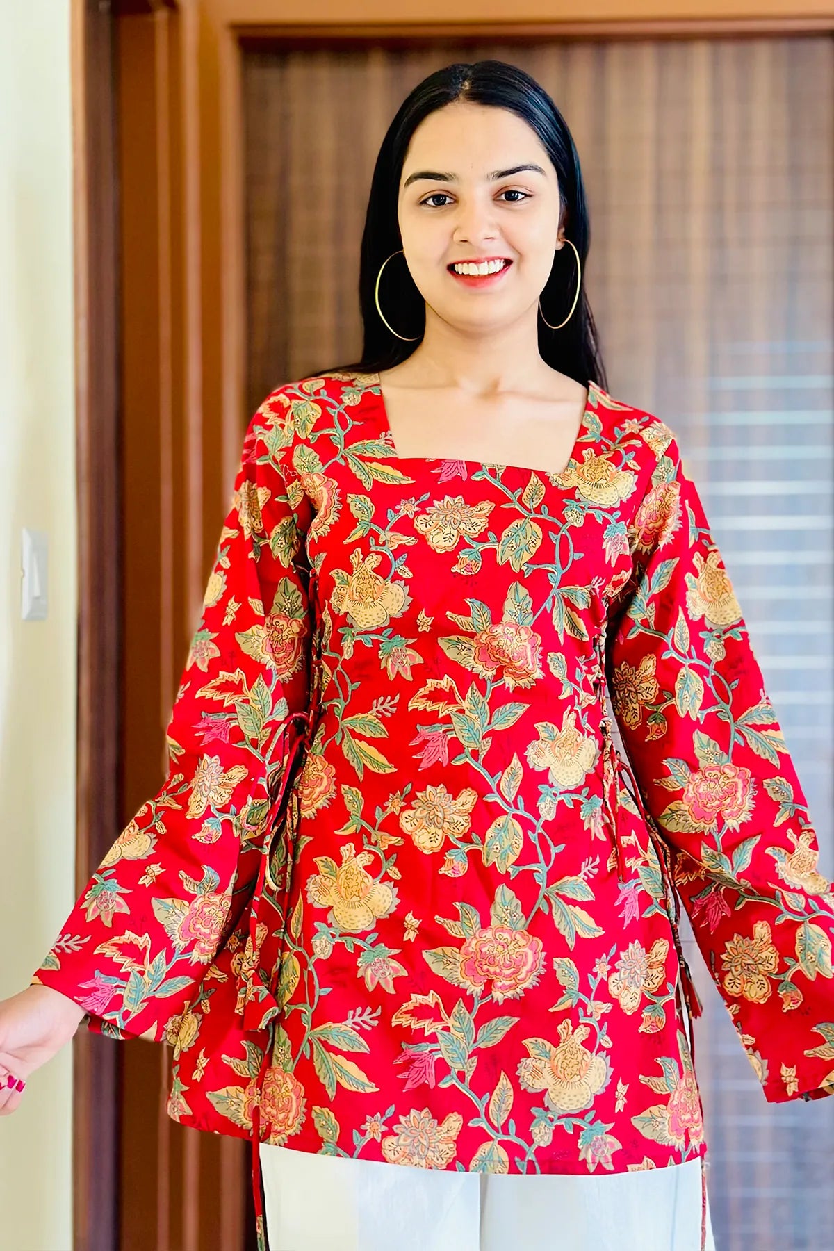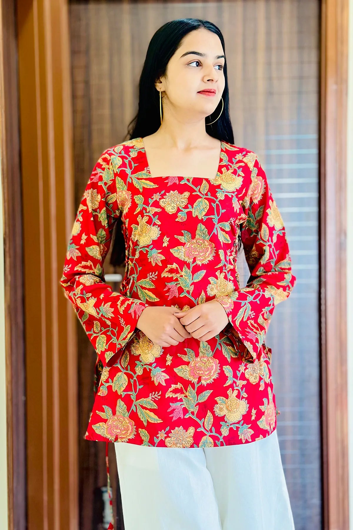Lightweight cotton peplum kurta with wide palazzo pants, offering a graceful festive-ready silhouette.