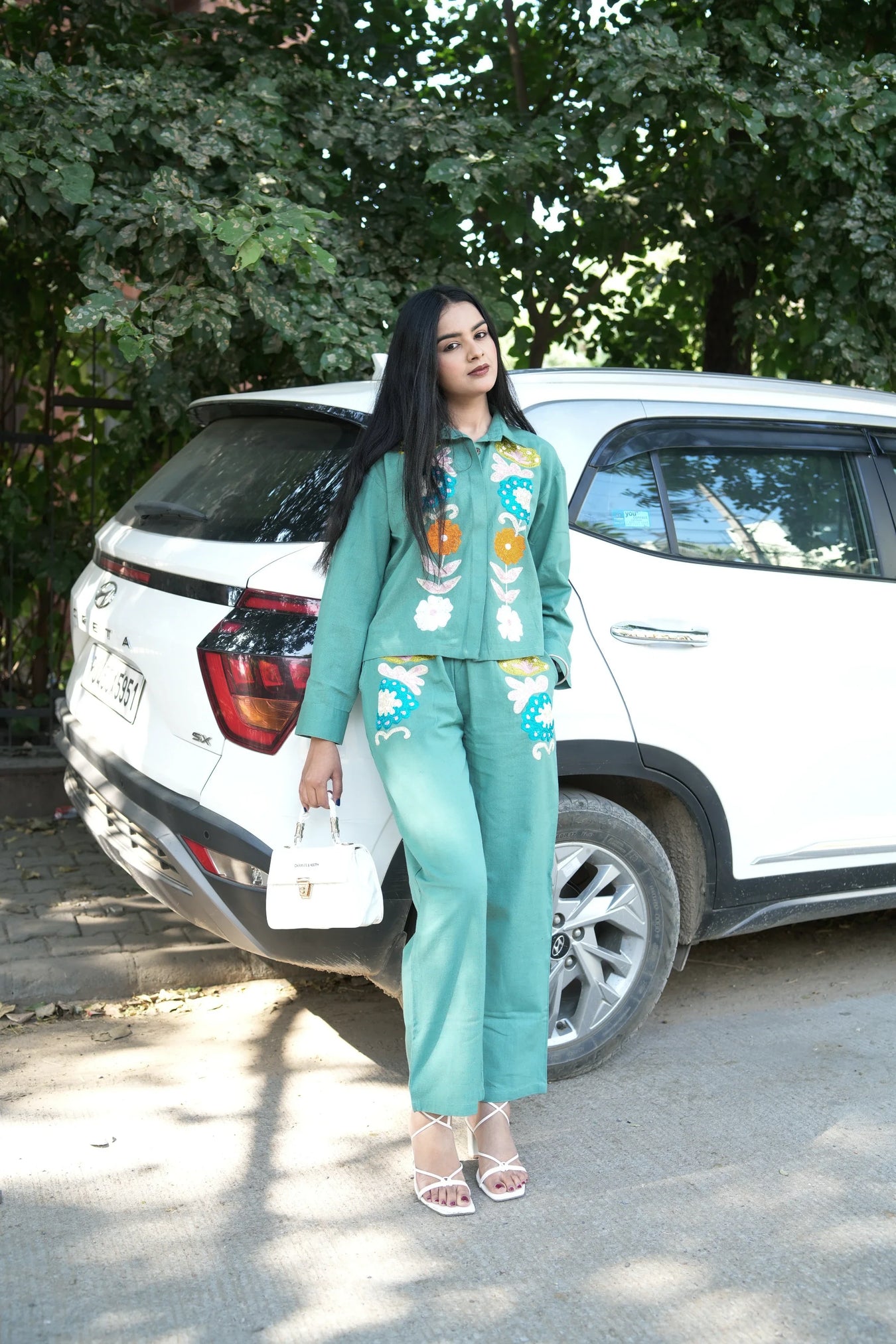 cotton flex embroidary work shirt cotton with full sleeves with embroidered wide leg touser cord set for womens.