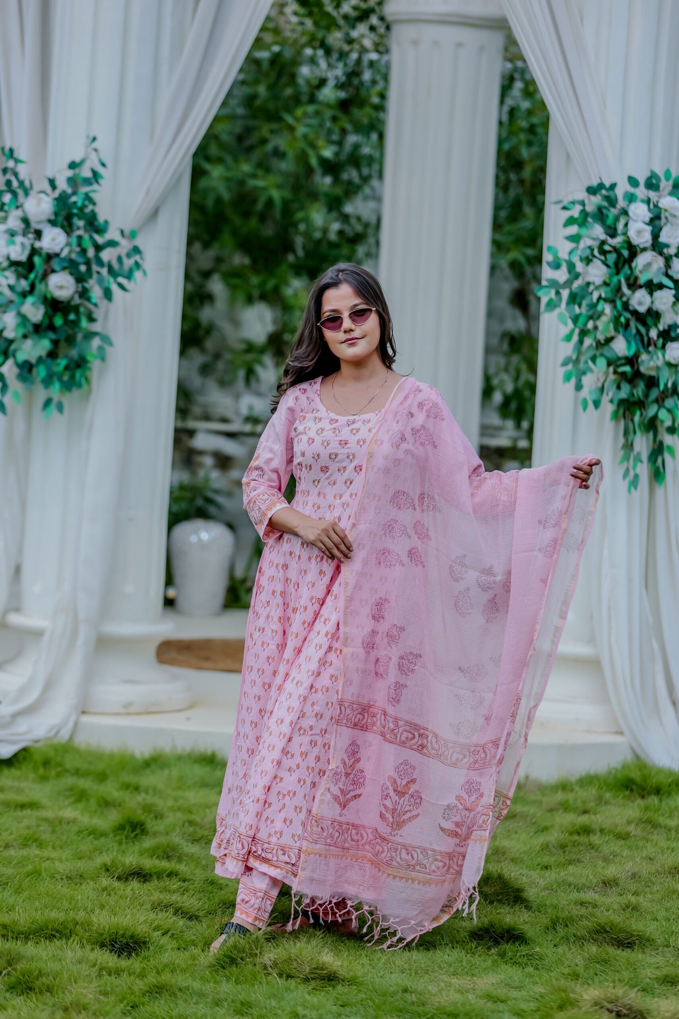 Step into elegance with this soft pink cotton kurta pant set, designed for women who love subtle yet stylish ethnic wear. The kurta features delicate all-over floral block prints, a round neckline, and three-quarter sleeves. It is paired with matching pants and a lightweight dupatta adorned with traditional motifs and a graceful border. Perfect for festive occasions, casual get-togethers, and office wear, this outfit blends comfort with timeless ethnic charm.