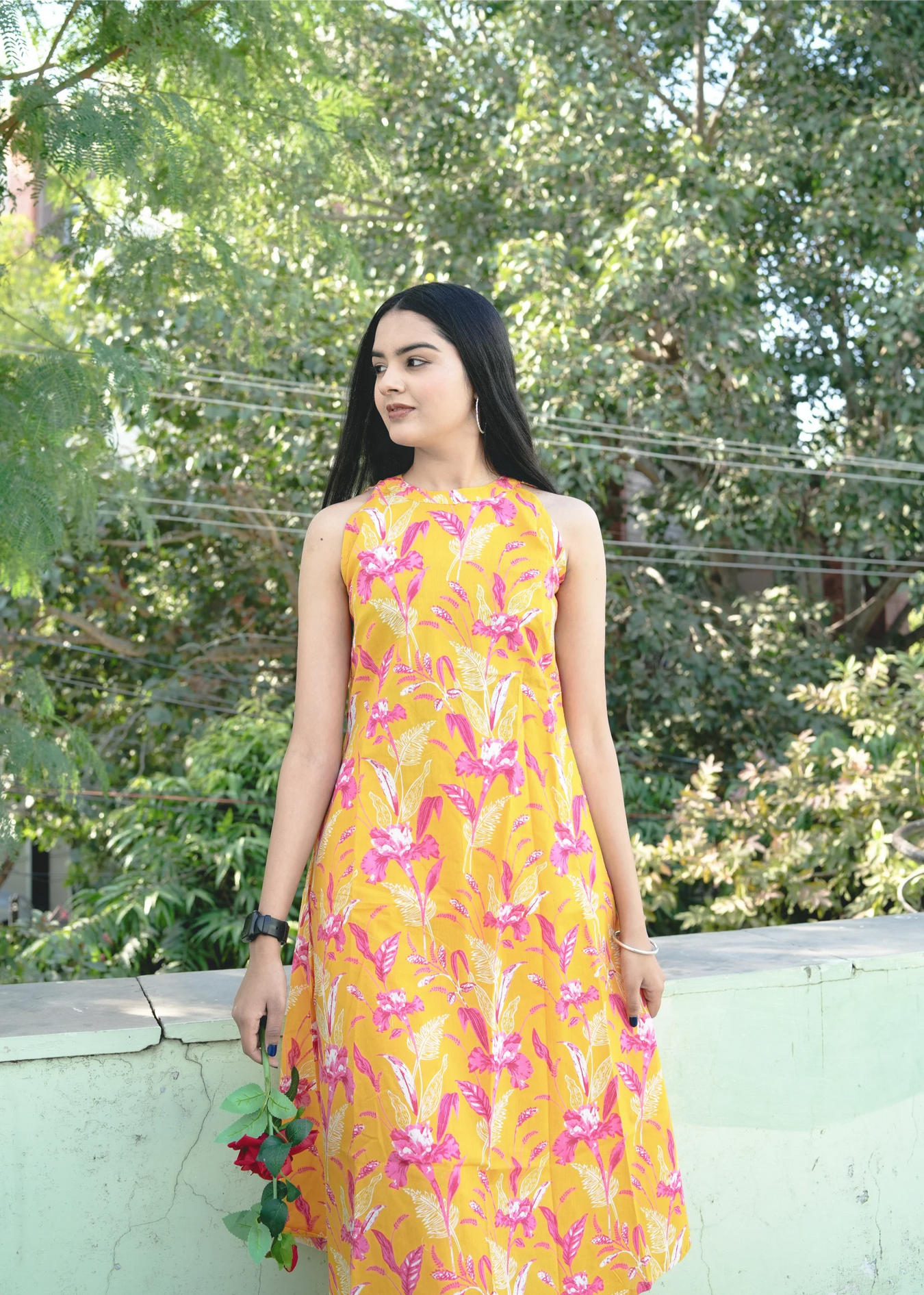 This sophisticated cotton kurti set combines timeless elegance with modern practicality. The sleeveless halter neck design frames the shoulders beautifully, while the flowing A-line silhouette ensures ease of movement and comfort throughout the day. Functional side pockets provide convenient storage without disrupting the garment's clean lines. The vibrant yellow floral print adds visual interest and versatility, pairing effortlessly with the accompanying straight palazzo pants. Ideal for warm climates, this breathable cotton ensemble works equally well for casual wear or semi-formal occasions, making it an essential addition to any woman's wardrobe.